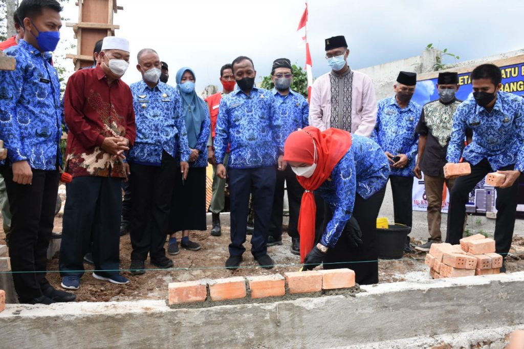 BANDARLAMPUNG- Walikota Bandar Lampung Eva Dwiana melakukan peletakan batu pertama pembangunan Masjid Jami Al-Munawwaroh di RT.08 Lk.1 Kelurahan Kedaung, Kecamatan Kemiling, Kamis (17/2/2022).