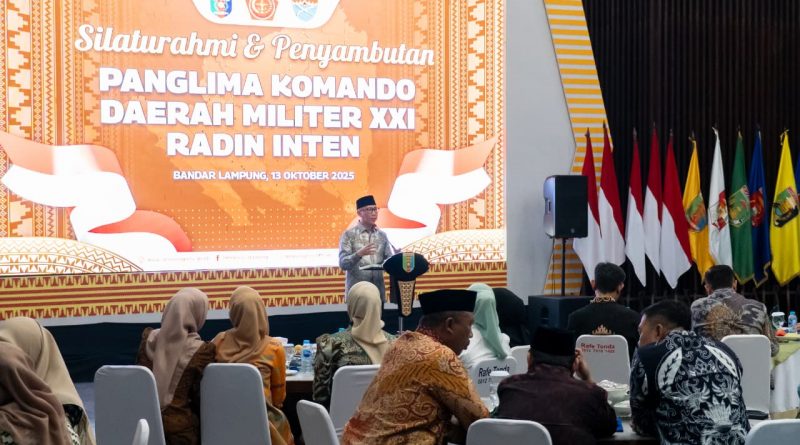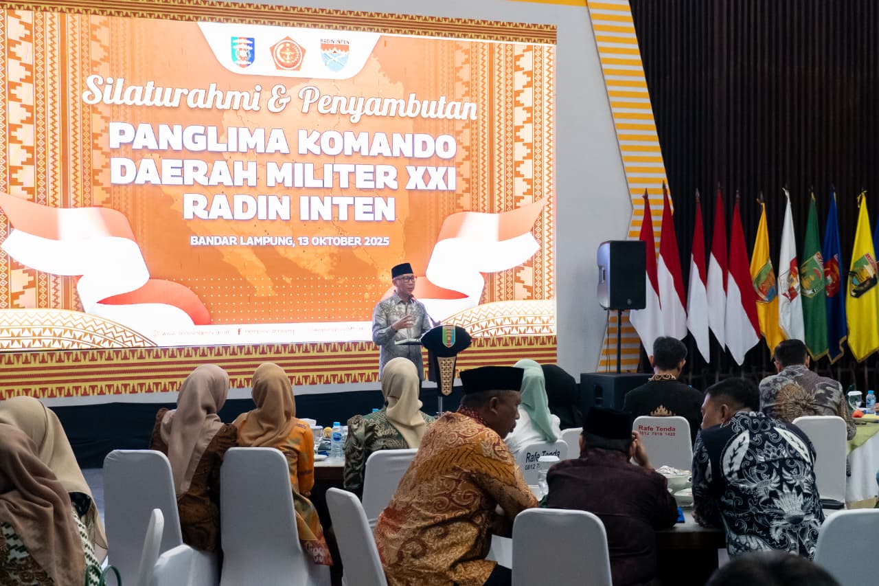 Bandar Lampung — Gubernur Lampung, Rahmat Mirzani Djausal, menggelar Silaturahmi dan Penyambutan Panglima Komando Daerah Militer (Kodam) XXI Radin Inten, Mayor Jenderal TNI Kristomei Sianturi, bertempat di Mahan Agung, Senin (13/10/2025).