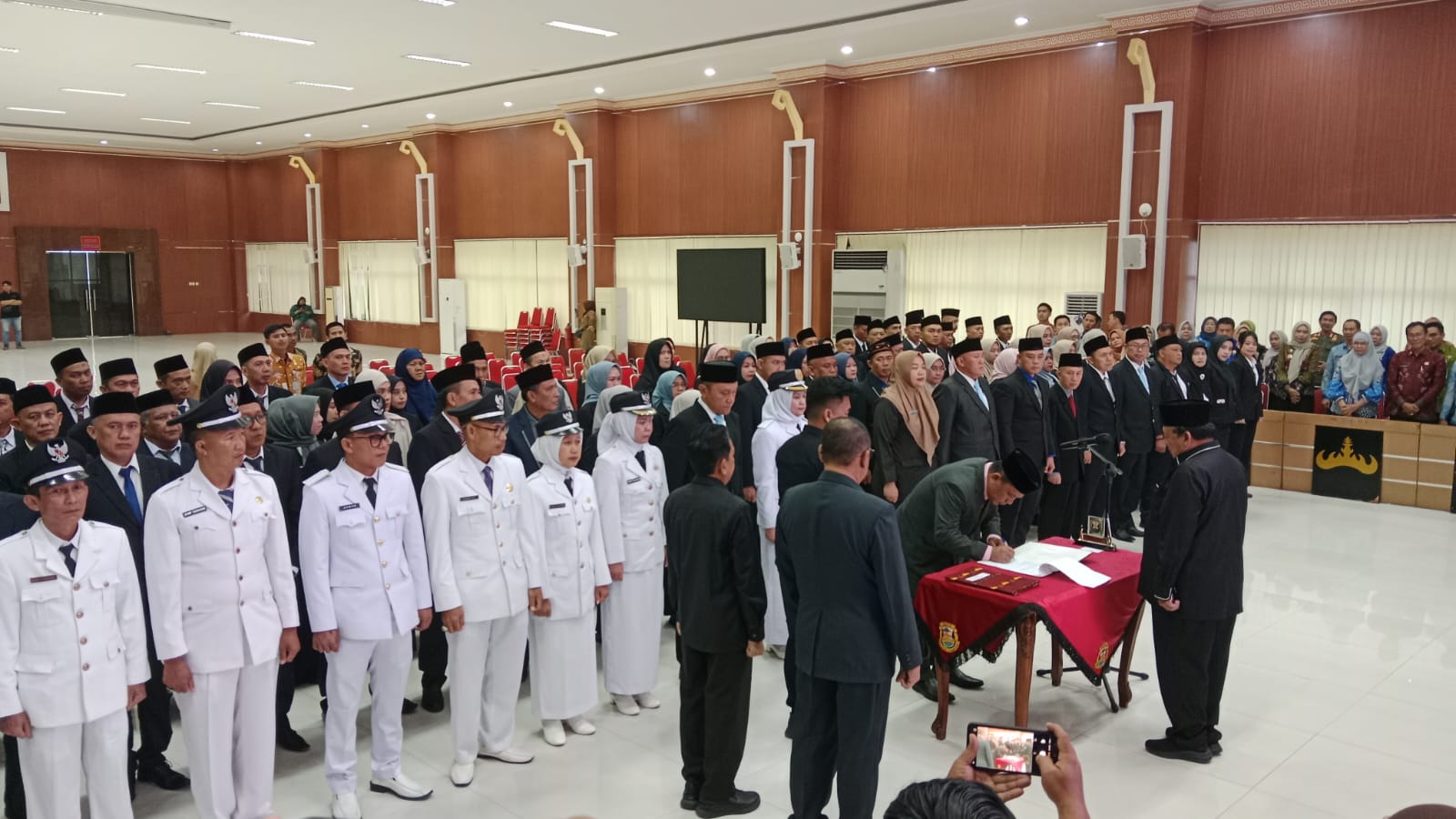 BANDAR LAMPUNG- Walikota Bandarlampung yang diwakili oleh wakil walikota Bandarlampung Dedy Amarullah melakukan pelantikan serta pengambilan sumpah jabatan Direktur Utama Bank Waway, Pejabat Administrator, Pengawas dan Kepala Puskesmas kota Bandarlampung di Gedung Semergo, Jum’at (13/2/2026).